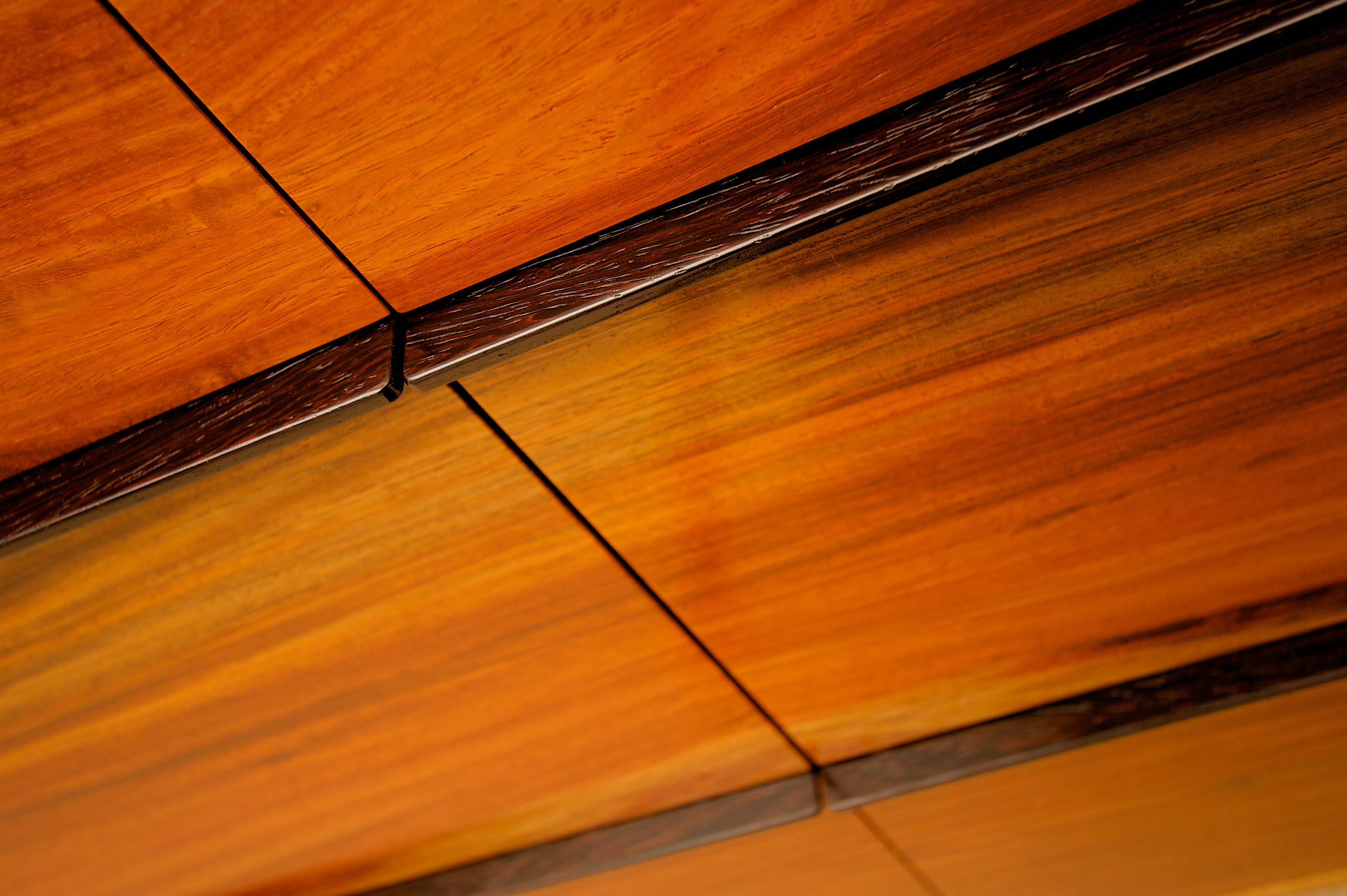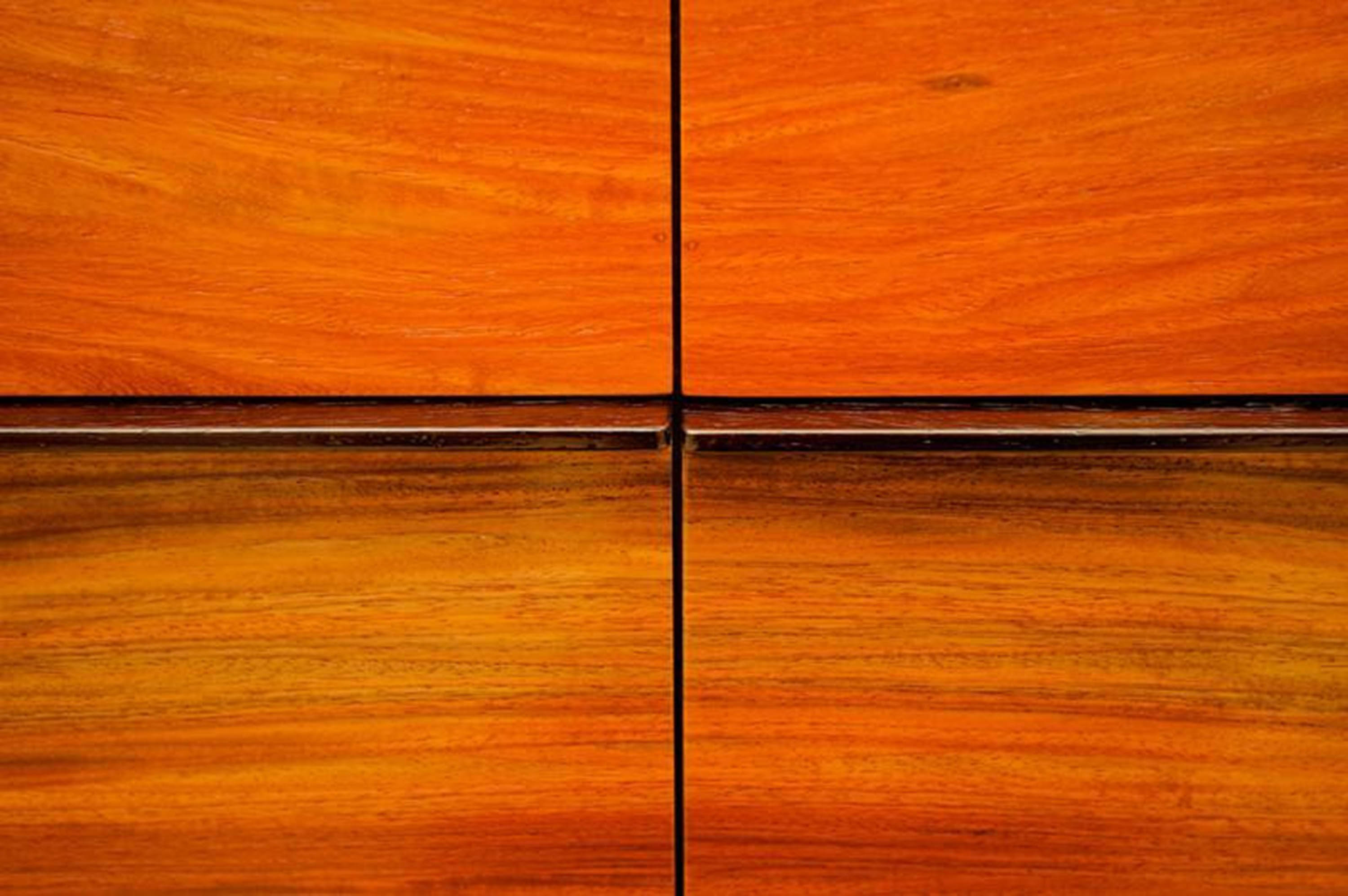 The gorgeous timber grains in this very unique piece of rosewood are the main feature of this beautiful sideboard. The golden brown cabinet frames the drawer faces which are highlighted with streaks of dark red and subtly balanced against the deep dark colour of the Wenge handles.