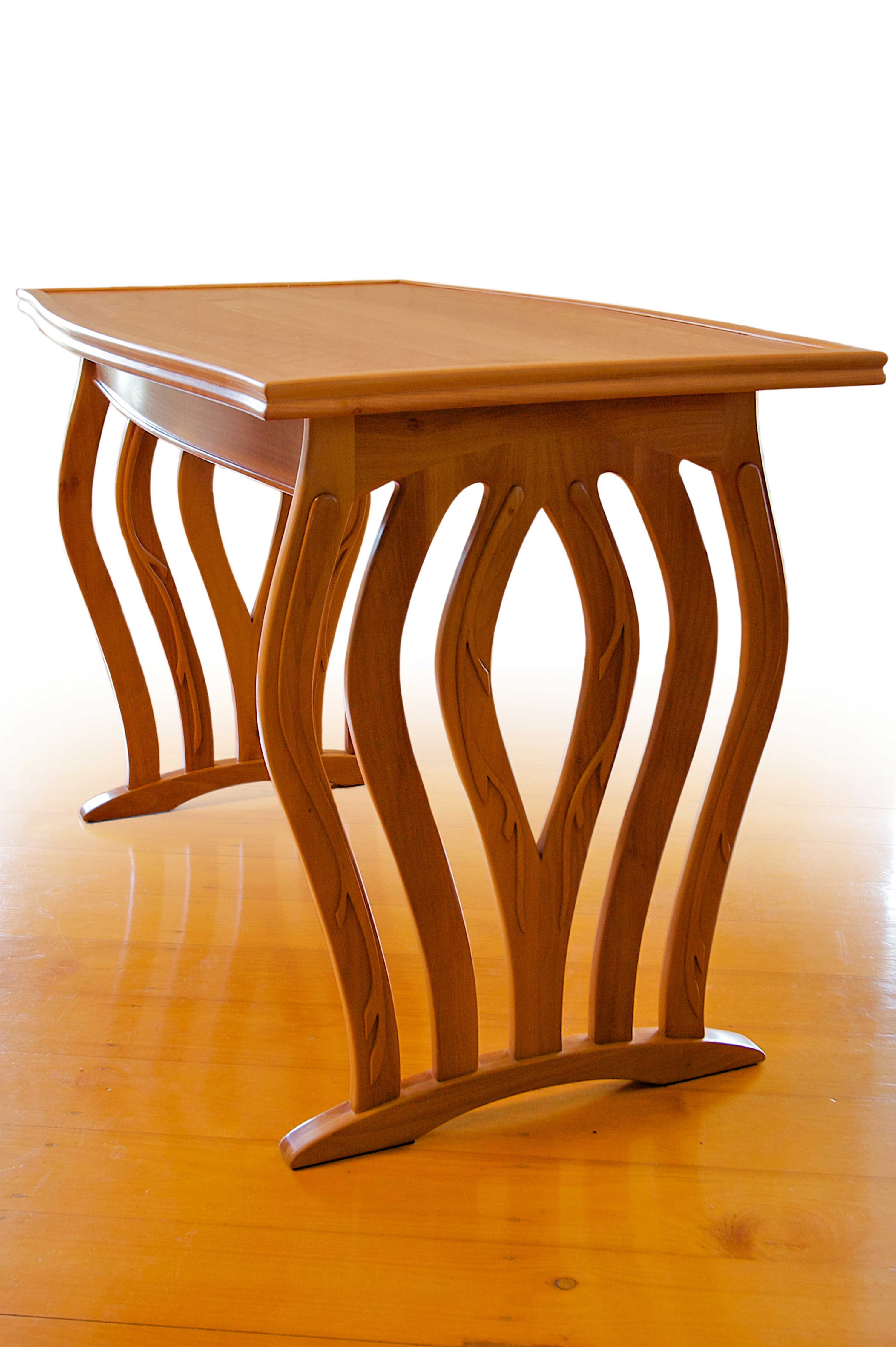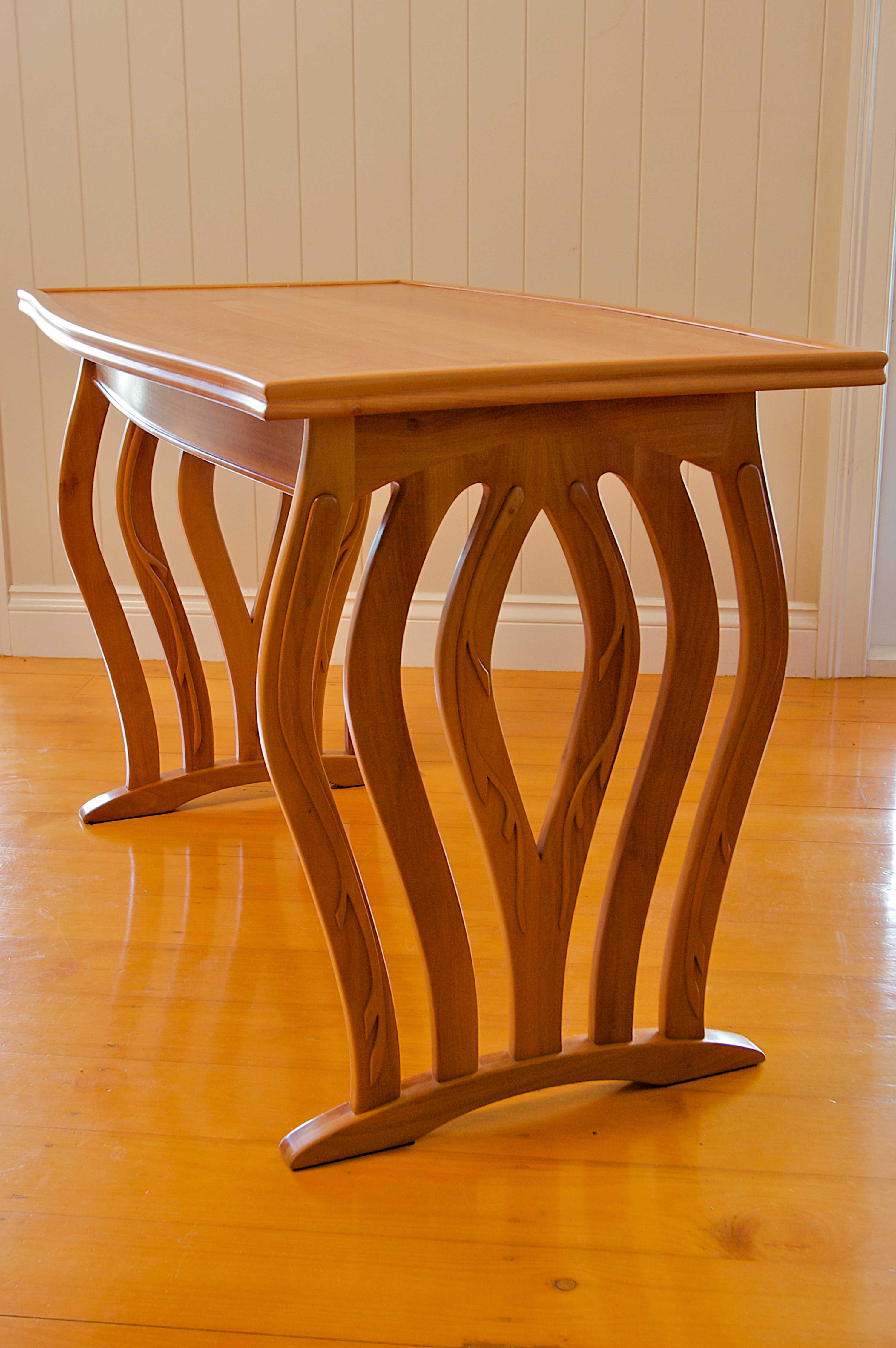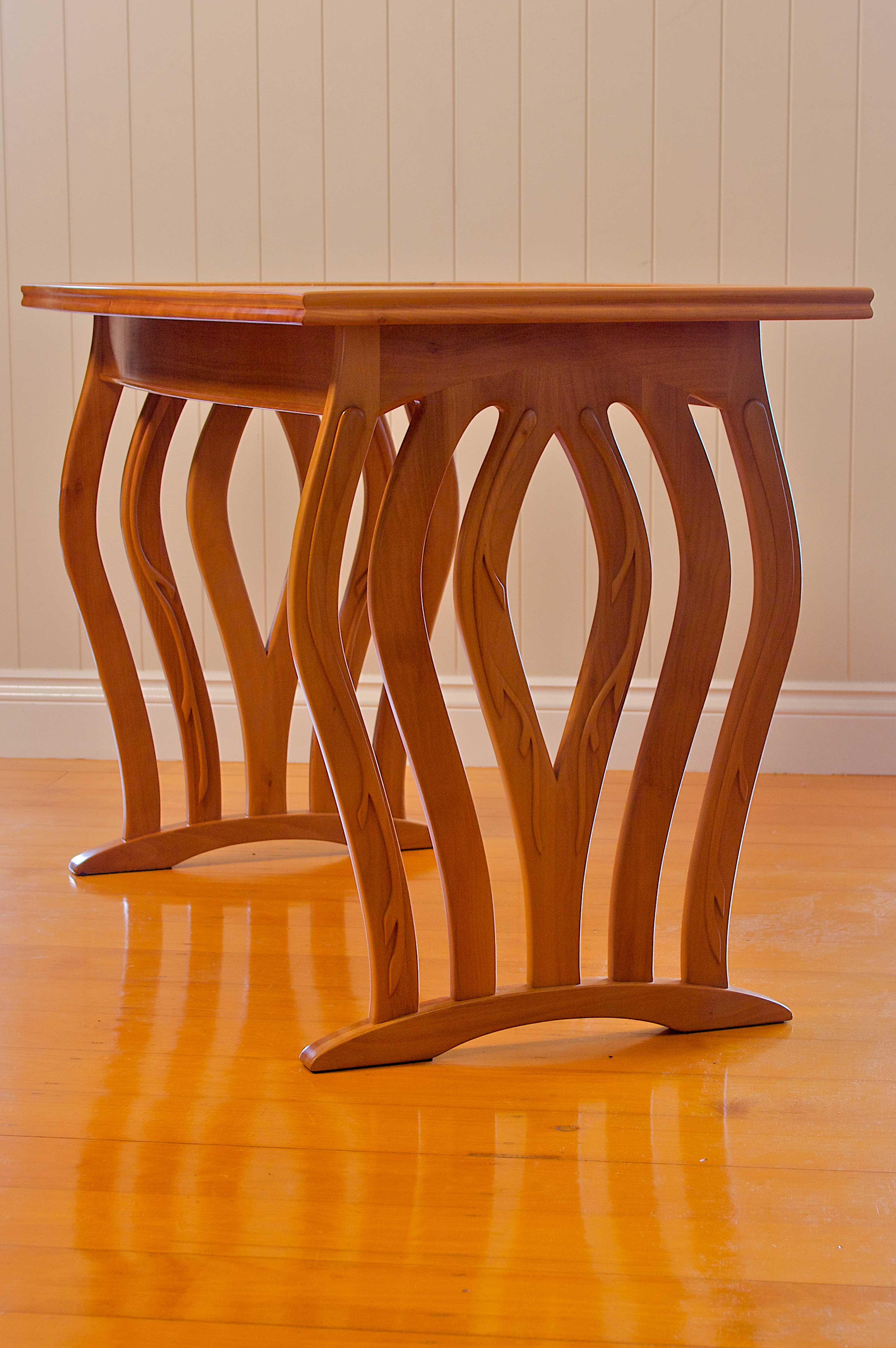 Inspired by the delicate beauty and curved lines of the Tasmanian Myrtle tree with its long winding branches, this table is hand shaped to replicate the branch-like features of its namesake. The rich golden hues and marbled grains show up beautifully in this elegant and exquisite accent piece for the home or business.